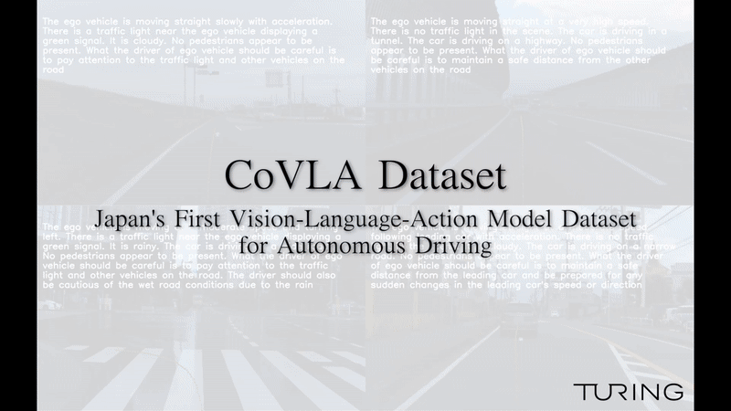Turing Inc. (Headquarters: Shinagawa, Tokyo; CEO: Issei Yamamoto; hereinafter “Turing”), a company dedicated to the development of fully autonomous vehicles, is proud to announce the development of the “CoVLA Dataset,” Japan’s first Vision-Language-Action (VLA) model dataset for autonomous driving. A portion of this dataset has been made publicly available, and the research paper “CoVLA: Comprehensive Vision-Language-Action Dataset for Autonomous Driving” (hereinafter “the paper”) has been accepted for presentation at the IEEE/CVF Winter Conference on Applications of Computer Vision 2025 (WACV 2025). This achievement is part of the company’s efforts under the Ministry of Economy, Trade and Industry (METI) and NEDO’s GENIAC AI development program.