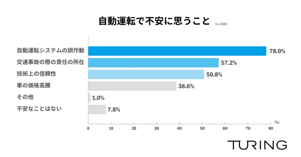 自動運転で不安に思うことがあるか尋ねたところ、「自度運転システムの誤作動」が78.0%で最も多く、「交通事故の際の責任の所在」が57.2%、「技術上の信頼性」が50.8%と続きました(n=500)。