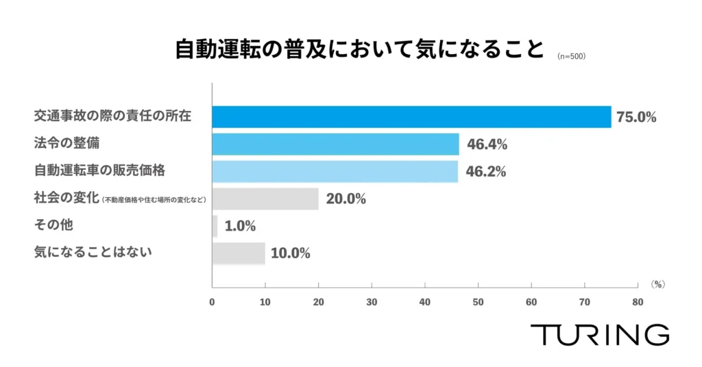 自動運転の普及において気になることについて尋ねたところ、「交通事故の際の責任の所在」が75.0%で最も多く、「法令の整備」が46.4%、「自動運転車の販売価格」が46.2%と続きました(n=500)。