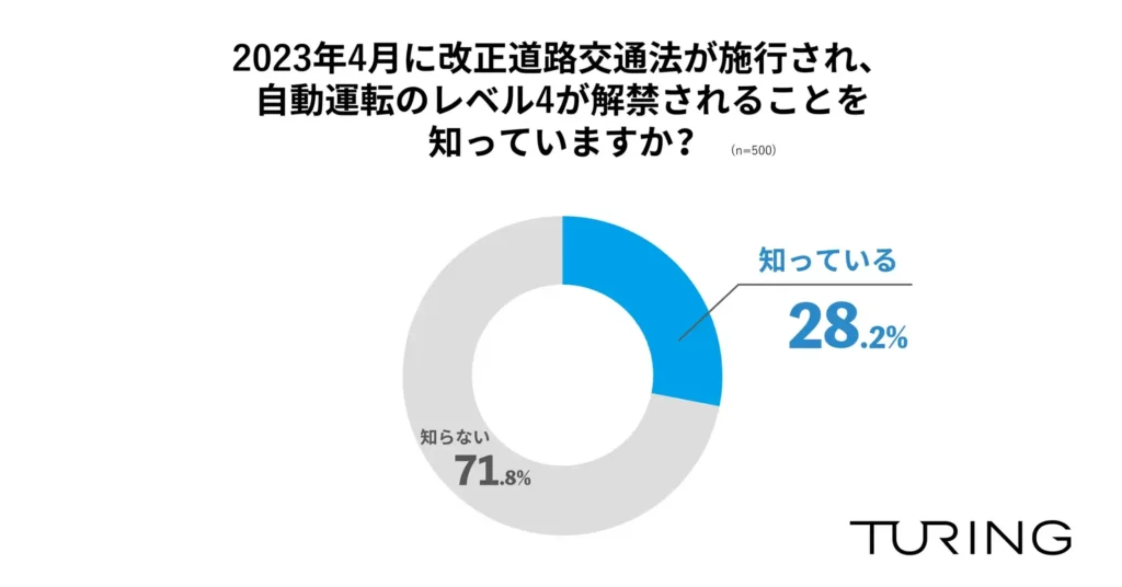 2023年4月に改正道路交通法が施行され、自動運転のレベル4が解禁されることを知っているか尋ねたところ、「知っている」が28.2%で、3割程度の人しか知らないことがわかりました(n=500)。