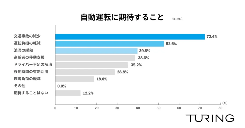 完全自動運転車両の開発・販売に取り組むTuring株式会社(千葉県柏市、代表取締役:山本 一成、以下「チューリング」)は、全国の運転免許を持っている人を対象に「自動運転に関する調査」を実施し、500名から回答を得ました。