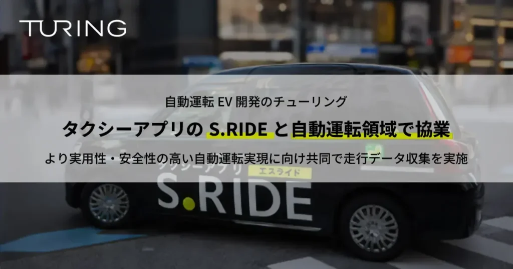 完全自動運転車両の開発・販売に取り組むTuring株式会社(東京都品川区、代表取締役:山本 一成、以下「チューリング」)は、タクシーアプリ 「S.RIDE®(エスライド)」を提供するS.RIDE株式会社(本社:東京都港区、代表取締役:橋本洋平、以下「S.RIDE」)と、自動運転領域において協業を開始しました。その第一弾として、同社および大和自動車交通株式会社(東京都江東区、代表取締役社長:大塚一基、以下「大和自動車交通」)と共同で、自動運転AI開発のための学習用データ収集プロジェクトを実施しました。