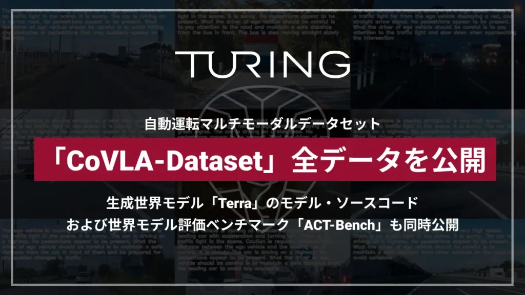 Turing株式会社(東京都品川区、代表取締役:山本 一成、以下「チューリング」)は、600万フレームにおよぶ世界最大規模の自動運転マルチモーダルデータセット「CoVLA-Dataset」の全データをオープンデータとして公開しました。また、同データセットを活用し、指定された未来軌跡への追随性を強化した生成世界モデル「Terra」のモデルファイルおよびソースコードも公開しました。さらに、世界モデルが与えられた行動指示にどれほど正確に追従できるか定量的に評価可能なベンチマーク「ACT-Bench」を発表しました。